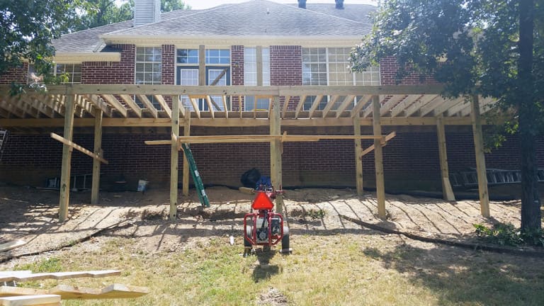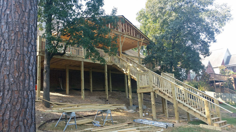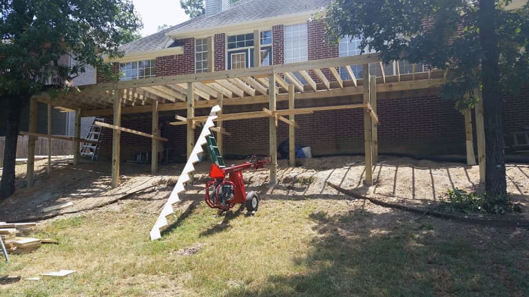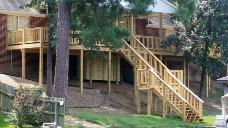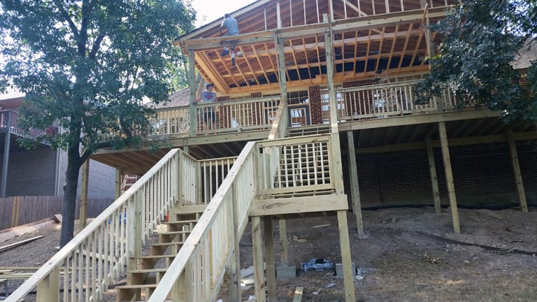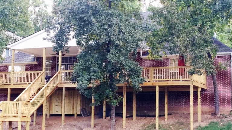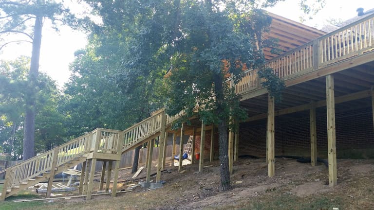 This custom deck stretches over 50 feet in length along the back of this beautiful home located on Lake Hamilton in Hot Springs, AR. The stairs were designed not only for looks appeal, but for for easy access to the dock side boating area. Incorporated in the design is a style integrated gable roof tied into the existing home structure with seamless construction. And to finish it off is a matching soffit ceiling area with can lighting and ceiling fans to tie everything together. This was a large project and as you can see our team excelled in every aspect!
